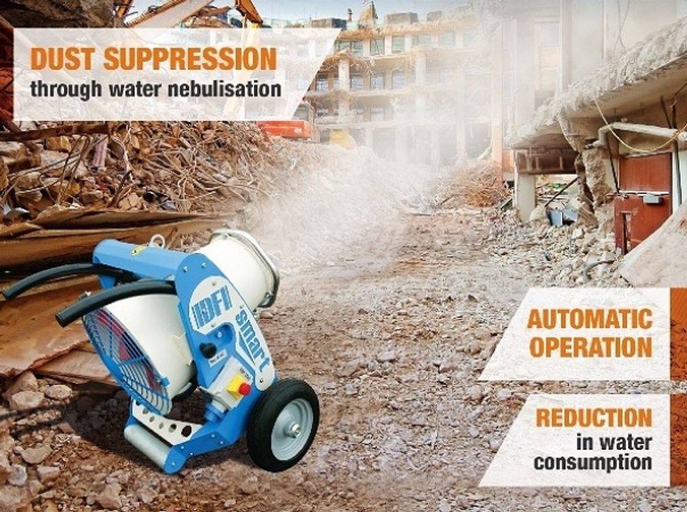 The Dust Fighter Smart Misting Cannon throws a plume of mist up to 13 metres to capture fine dust particles. Moreover because water-mists “float” more than a conventional spray it covers and envelops the dust cloud more effectively.