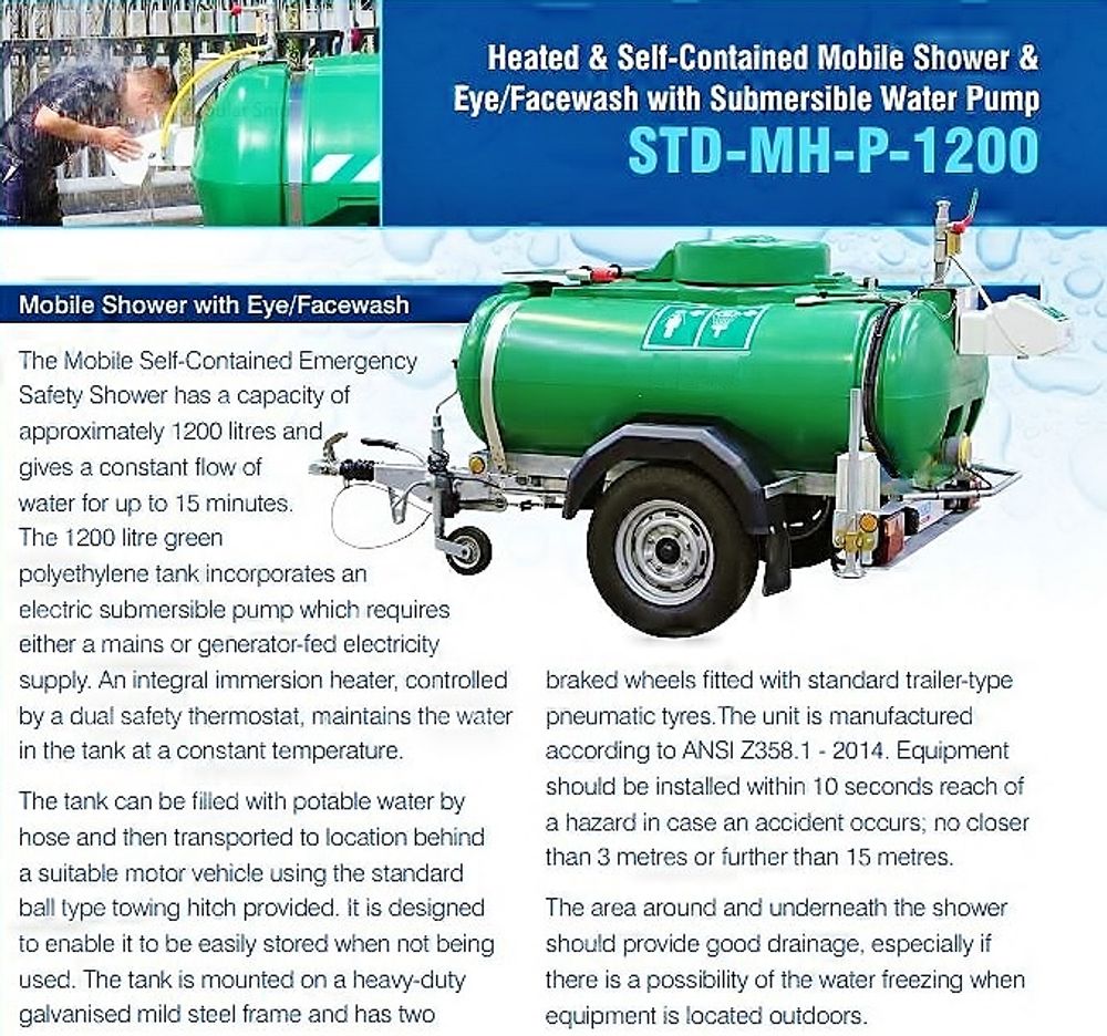 The MH-P-1200 Heated Safety Shower & Eyewash is a highway towable trailer with tank capacity of 1200 litres that provides a drenching shower of tepid water for up to 15 minutes.