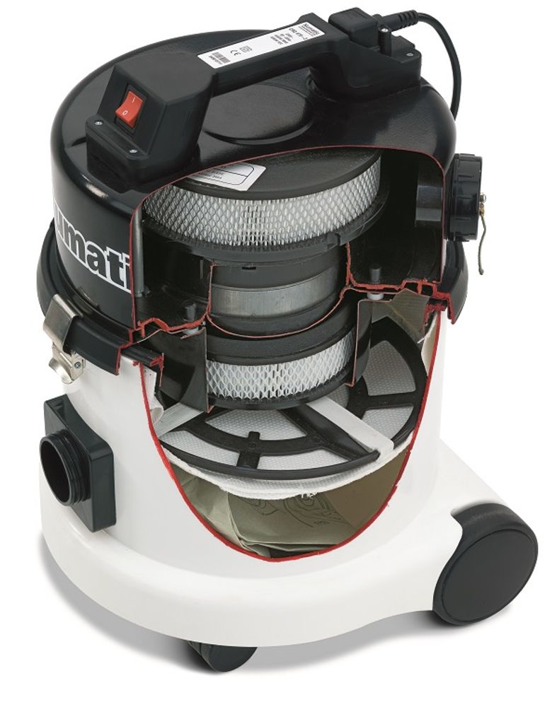 As the image shows these machines are equipped with both a HEPA filter before the vacuum motor, and the discharge air is filtered again after the motor, so that even the minute amount of dust / swarf generated by the motor is removed before the air is returned to the room.