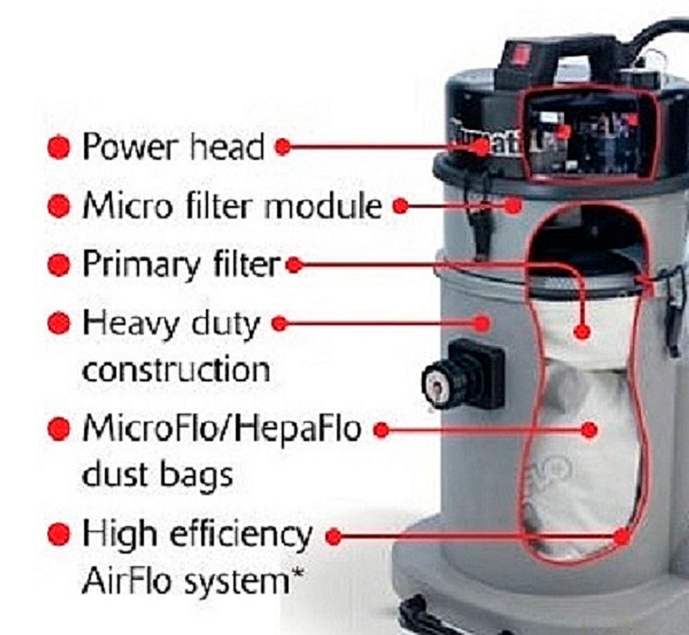 The HepaFlo dust-bag, together with the primary crossflow filter, maximises airflow to the HEPA (Micro) filter module; once full dust-bags can be changed in a matter of seconds.