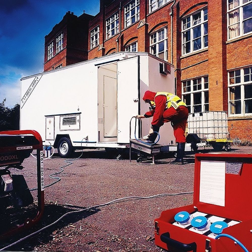 Unlike a static jack-leg unit these mobile trailers can be sited and re-sited without the need for a crane, and can be towed by most medium-sized vans or cars. The integral generator is enclosed for quiet operation, and LPG versions will run for approx. 50+hours on one 13kg propane gas cylinder. They can be supplied to site with their integral water tanks ready filled, and can be operating within 10 minutes of arrival.