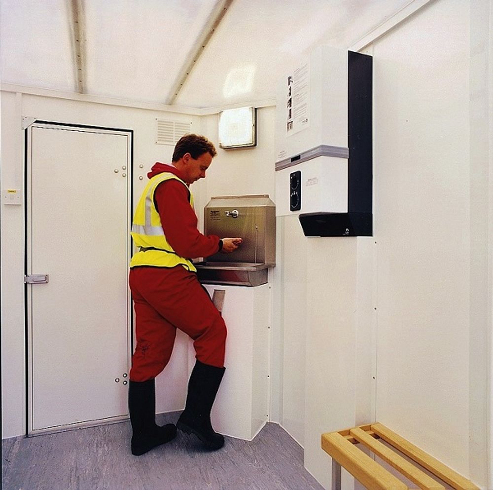 For decontamination purposes there are three compartments which provide separate, designated, "dirty", "shower" and "clean areas", and thermostatically regulated showers provide safe and comfortable decontamination. A stainless steel wash basin is provided for full forearm cleansing and hot water is supplied by a LPG balanced flue room-sealed water heater. An integral water tank supplies clean water for the showers and wash basins, with a tank capacity ranging from 200 litres to 360 litres (model dependent).